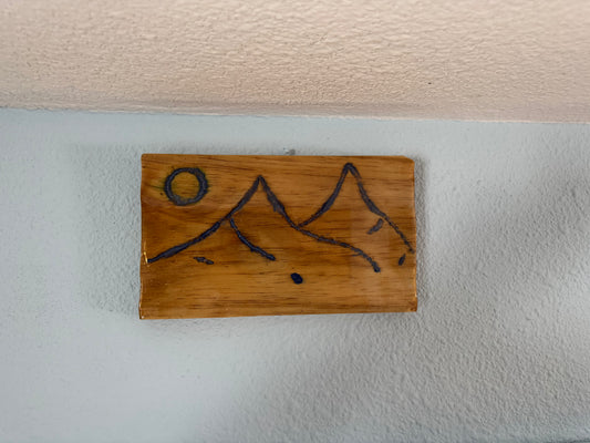 Engraved Mountains filled with blue resin on wood panel (version 1)